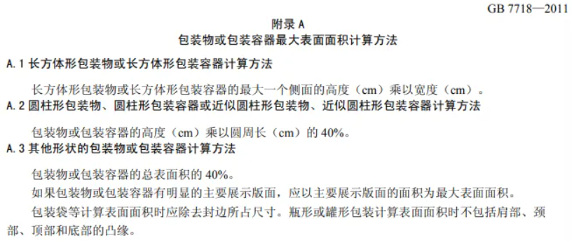 👉Calculation of maximum surface area: It is recommended that you refer to the calculation method for the maximum surface area of packaging or packaging containers in Appendix A of GB 7718-2011 "National Food Safety Standard - General Principles for Labeling of Prepackaged Foods".